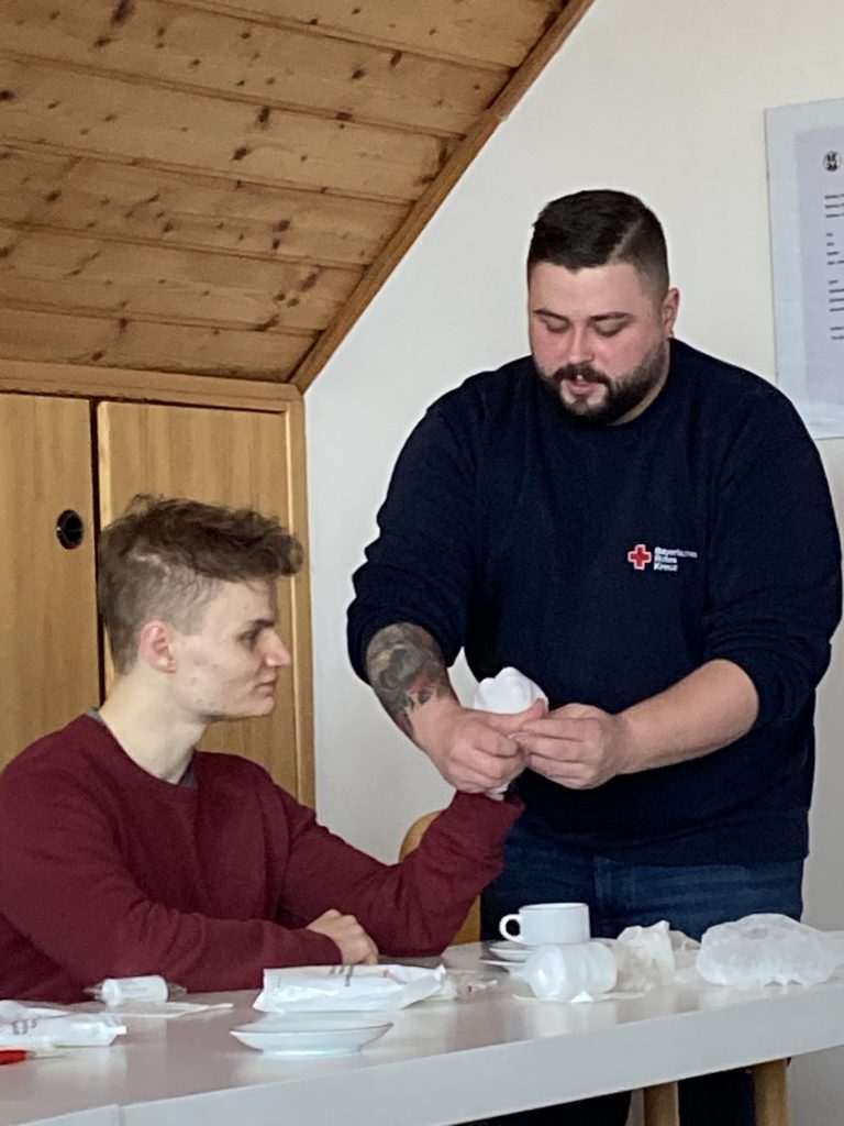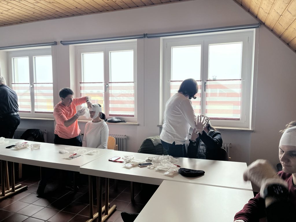 Anders als bei üblichen Erste-Hilfe-Kursen begann die Schulung direkt mit Themen, die für den Feuerwehrdienst besonders relevant sind. Noah Lugert legte den Fokus zunächst auf die korrekte Anwendung der einsatzspezifischen Ausrüstung, die bei der Feuerwehr oft entscheidend für eine schnelle und wirksame Versorgung ist. So übten wir das Anlegen von Druckverbänden an Arm und Kopf und wurden eingehend in die Handhabung des Sanitätsrucksacks eingeführt. Auch die Versorgung von Verletzungen durch Verbrennungen und Unterkühlungen wurde ausführlich behandelt, da diese zu den häufigsten Unfallbildern bei Feuerwehreinsätzen gehören.