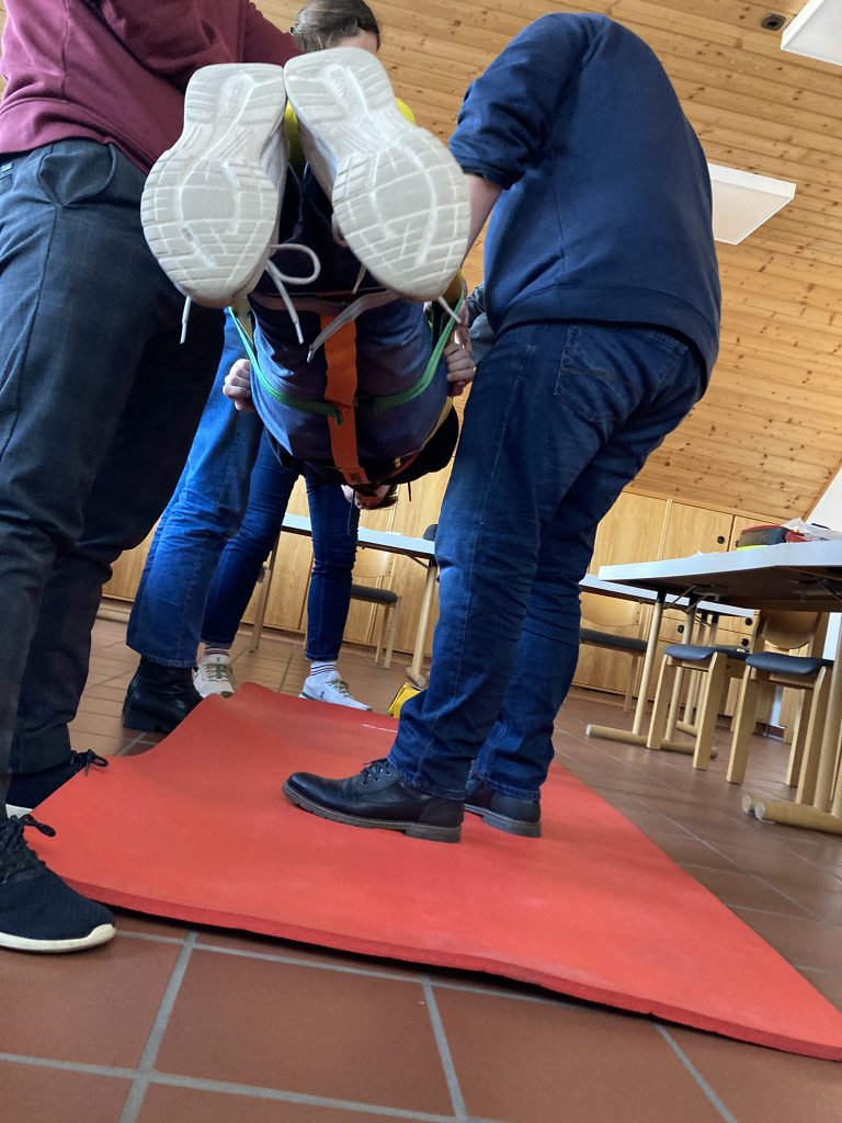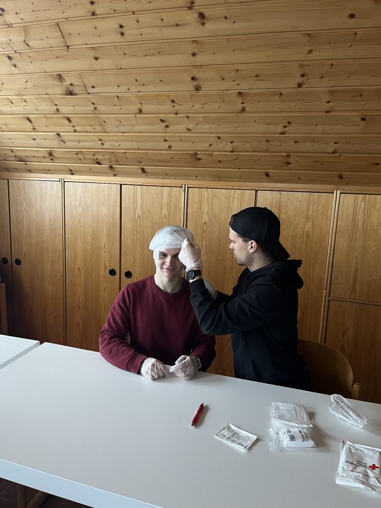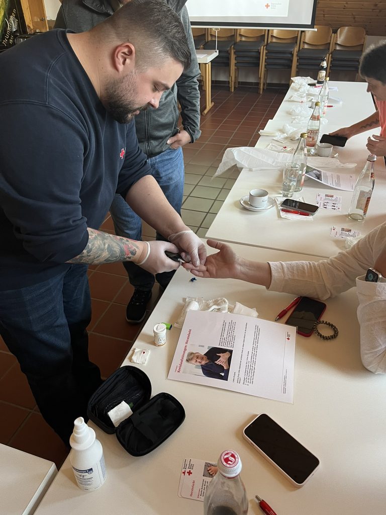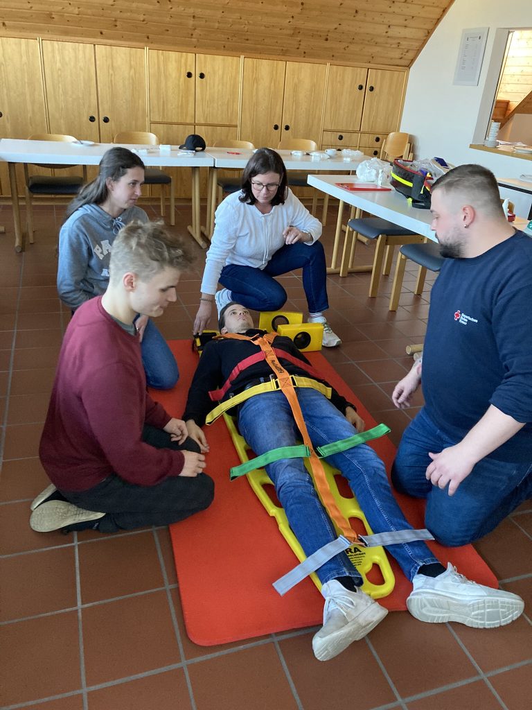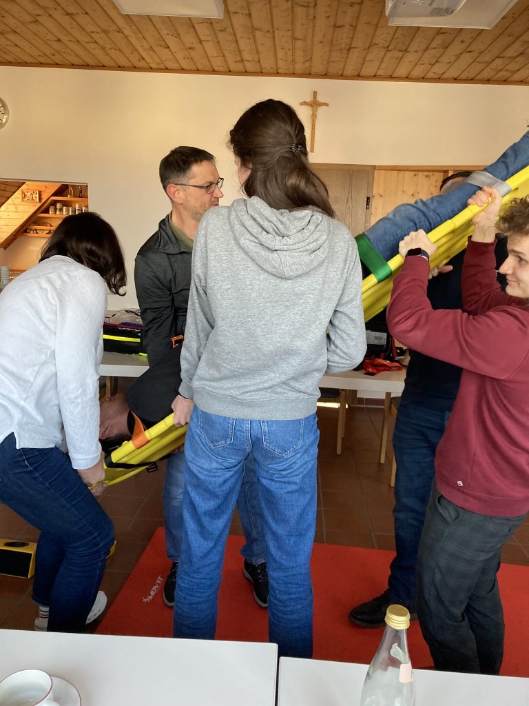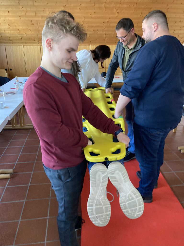 Die Teilnehmenden lernten zudem die Durchführung von Blutzuckermessungen und manuellen Blutdruckmessungen zur Ersteinschätzung von Notfallsituationen. Neben diesen diagnostischen Maßnahmen trainierten wir auch den Einsatz von Tourniquets zur Blutstillung und Stiffnecks zur Stabilisierung der Halswirbelsäule, sowie den Umgang mit dem Spineboard, das speziell für die sichere Rettung und Lagerung von Verletzten eingesetzt wird. Ein besonderes Augenmerk lag auf dem Vorgehen bei Verkehrsunfällen, wo eine schnelle, aber sichere Versorgung unabdingbar ist, sowie auf dem Umgang mit medizinischen Notfällen wie Herzinfarkten, Schlaganfällen und Krampfanfällen.