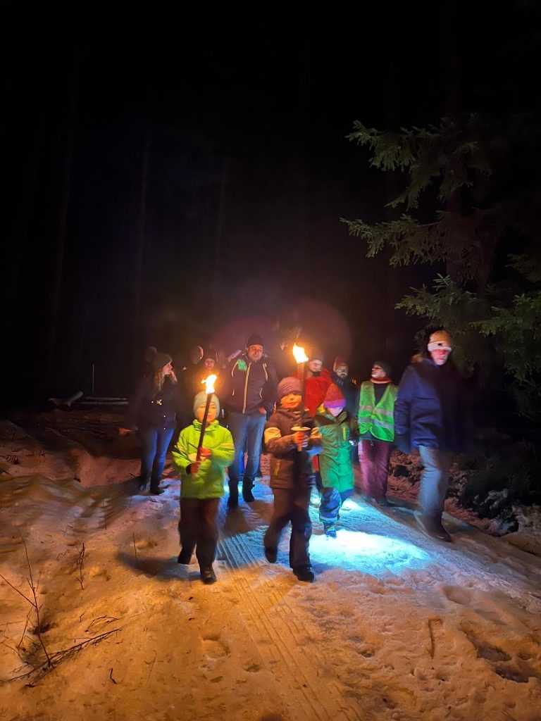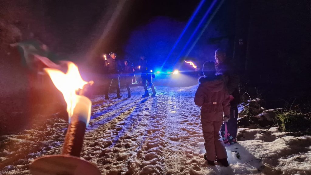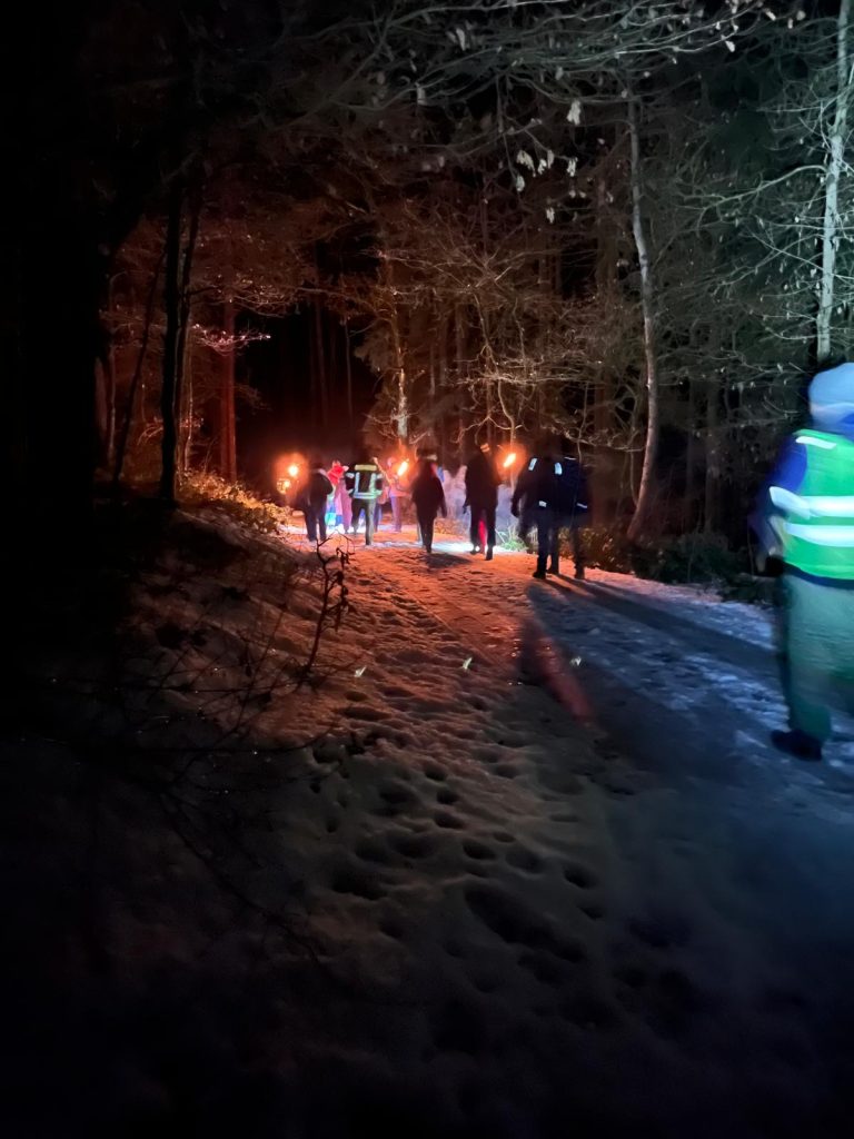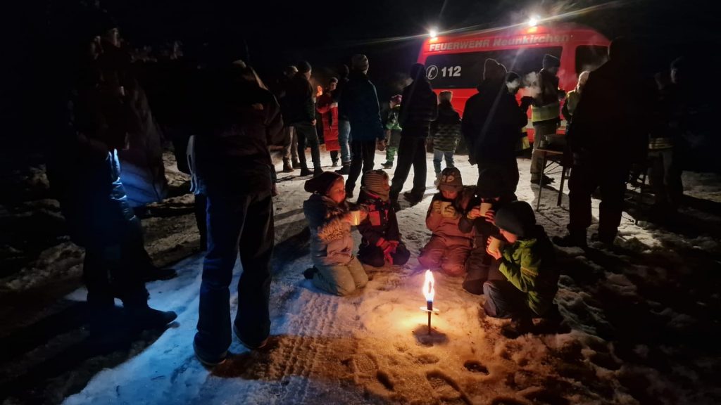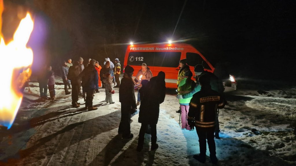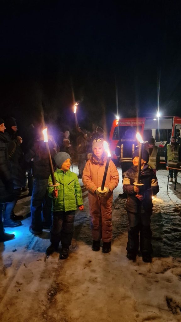 Ca. 35 Personen – davon viele Mitglieder der Kinderfeuerwehr trafen sich um 18 Uhr am Feuerwehrhaus in Neunkirchen. Nachdem die Kinder und einige der Erwachsenen mit Fackeln ausgestattet waren, ging es los. Über den Dorfausgang im Süden Richtung Mallersricht, vorbei am Gestüt und hoch zur „Schulleiten“, hinein in den Wald. Der zugefrorene Weg und die winterlichen Temperaturen machten das Vorankommen Teils etwas Mühsam, weshalb die Glühwein- und Kinderpunschpause nach der Hälfte der Strecke von allen Wandernden mit Freude angenommen wurde. Nach der kleinen Stärkung ging es durch den Wald nach Mallersricht zu unserer Partnerwehr. Dort wurde vom 1. Vorsitzenden Gerd Miederer der Grill bereits angeheizt und die Bratwürste brutzelten bereits, bereit, auf eine Semmel gelegt und gegessen zu werden. Auch vegane, fleischlose Bratwürste standen im Angebot. Für den Heimweg stand ein „Shuttledienst“ in Form unseres MZFs zur Verfügung. Wir bedanken uns bei allen Mitwandernden, für die rege Teilnahme und den schönen Abend!